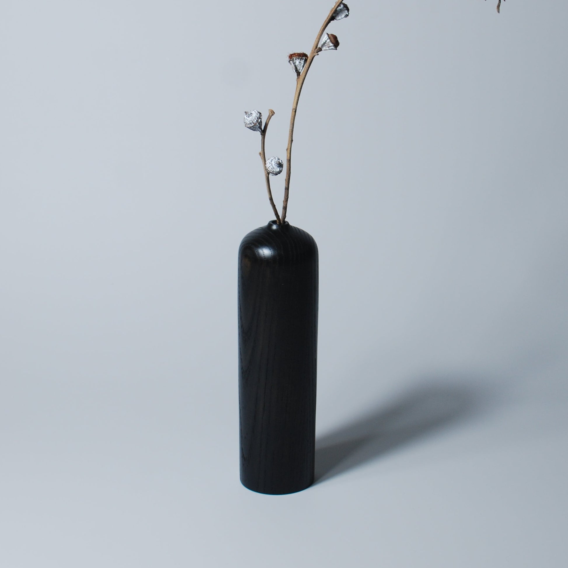 Crafted from natural ash wood and meticulously shaped by hand, this art vase features a sleek, elongated cylindrical form with smooth contours. The surface retains the subtle grain of the wood, enhanced by a deep black finish that adds a sense of calm sophistication and modern elegance. The small opening at the top is perfect for displaying dried branches, minimalist floral arrangements, or delicate stems, bringing a serene artistic presence to any space.
